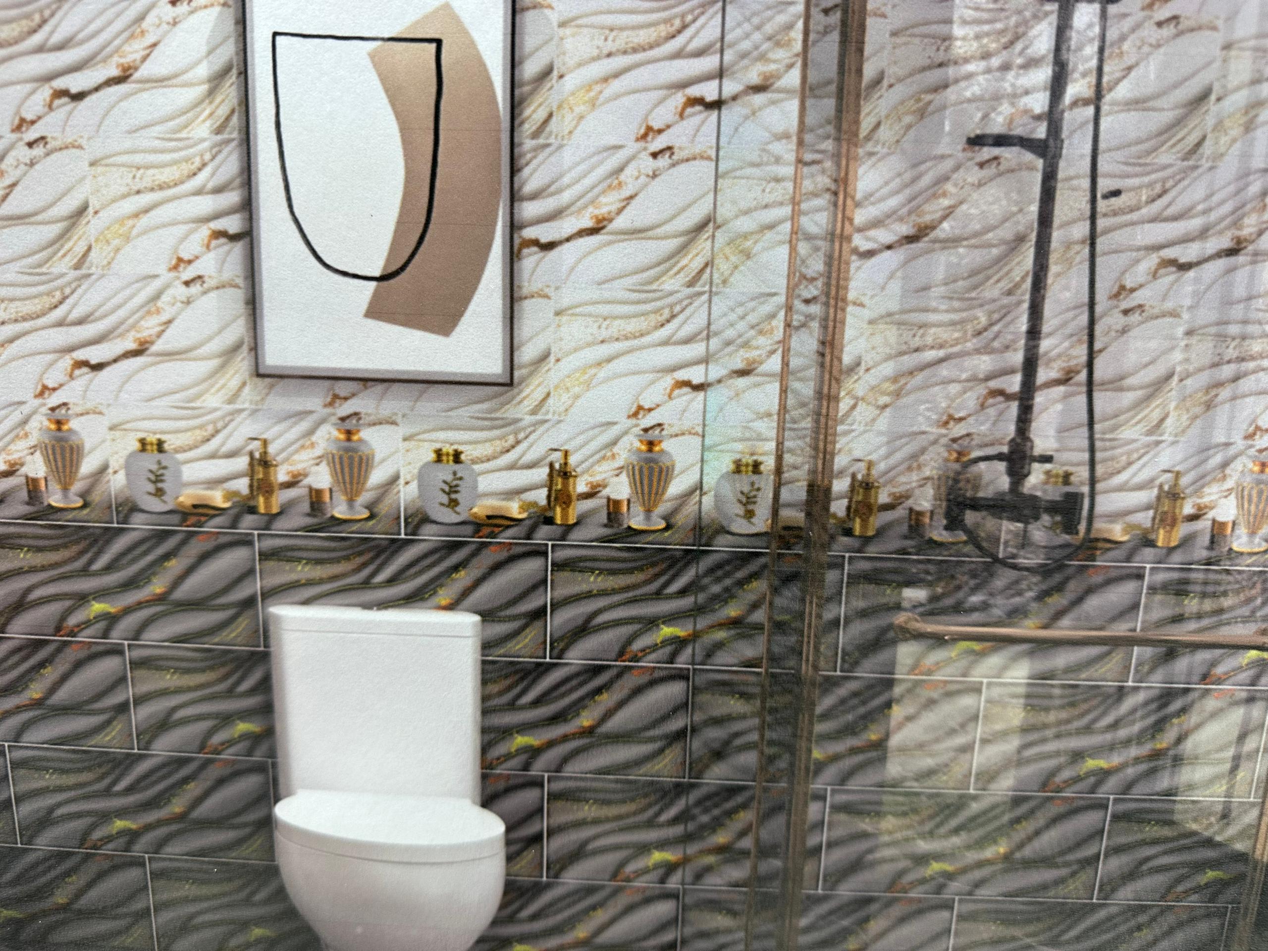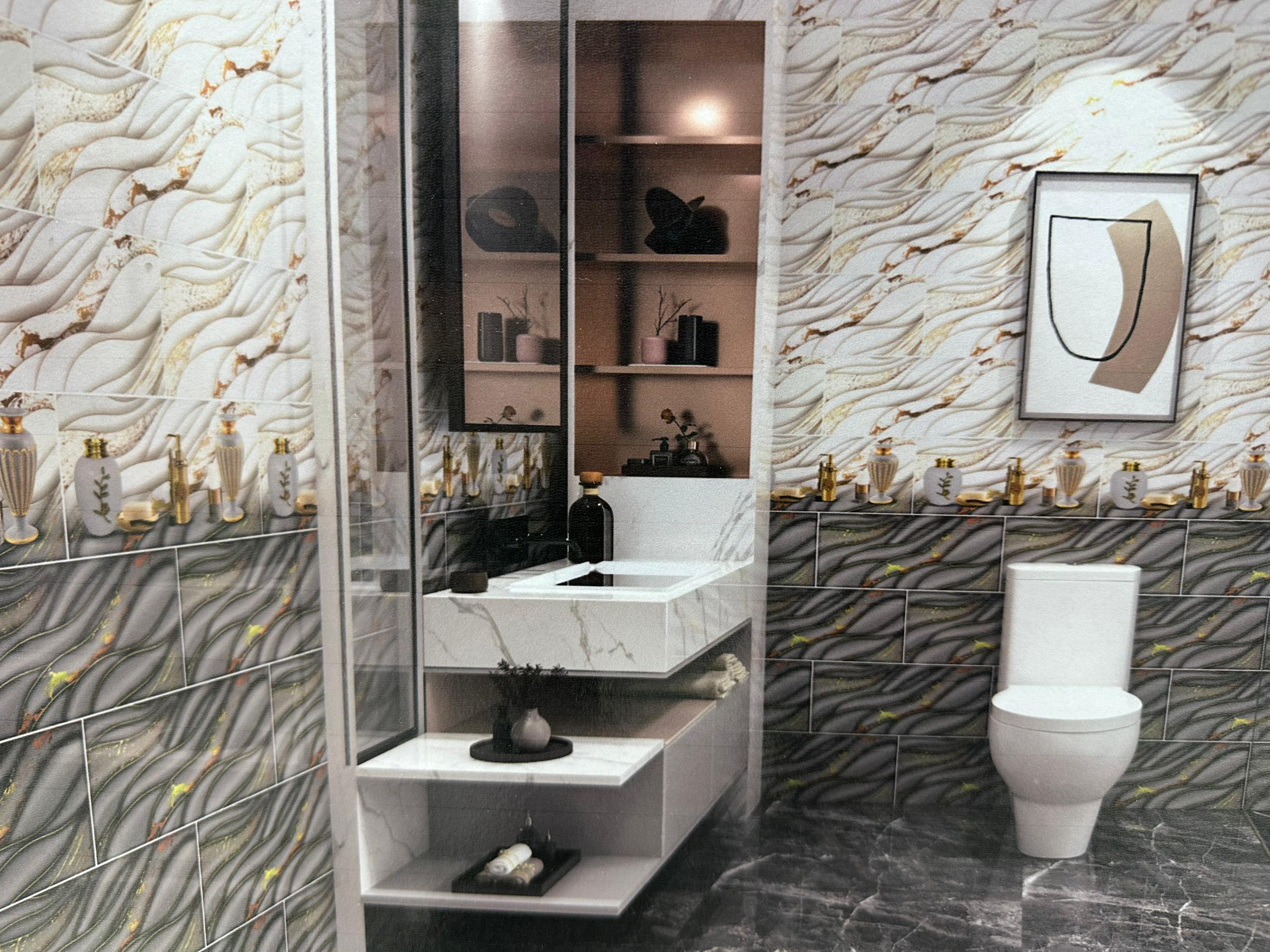 ajoutez une touche de raffinement a votre salle de bain avec ce modèle, PLUME aux tons Gris profond et blanc doux rehausse de subtiles lignes dorée.